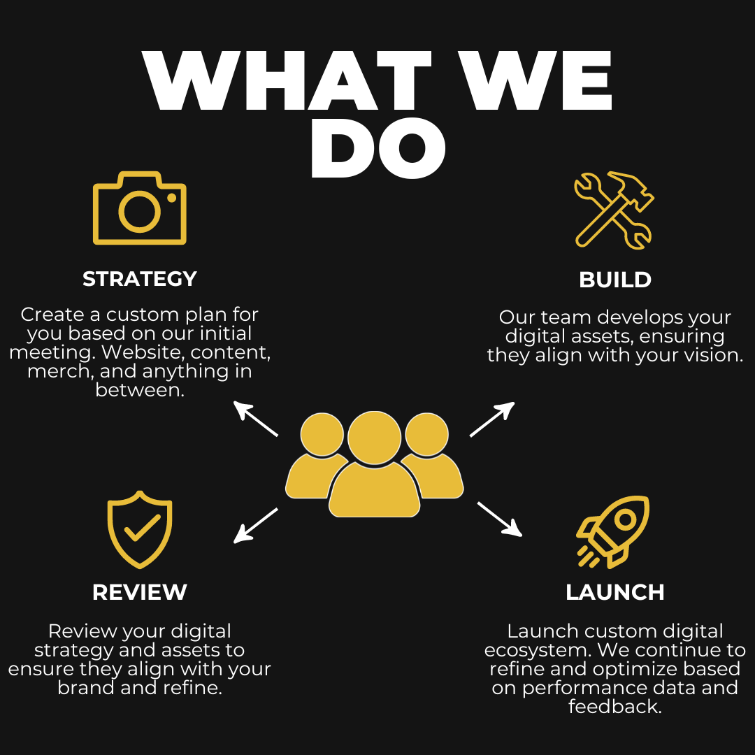 Our website design includes a custom, SEO-optimized site tailored to reflect your personal brand and career. It will feature a Home, About, Contact pages, and subscription options for fans to stay updated, along with optional features such as an integrated merch shop, an event calendar tied to your team/non-profit, and/or a media kit page.