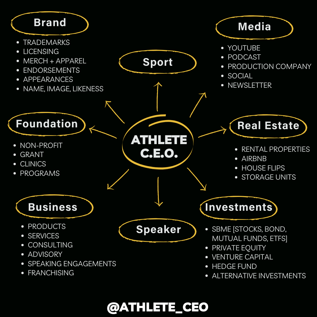 Our Athlete C.E.O. Template is a tool that helps you create a roadmap for your journey as an athlete-turned-entrepreneur. It will prompt you to think about various buckets like brand building, sports related jobs, media presence, investment opportunities, philanthropy, and more. This template is essentially your personal guide to building a holistic, successful brand that goes beyond the game.